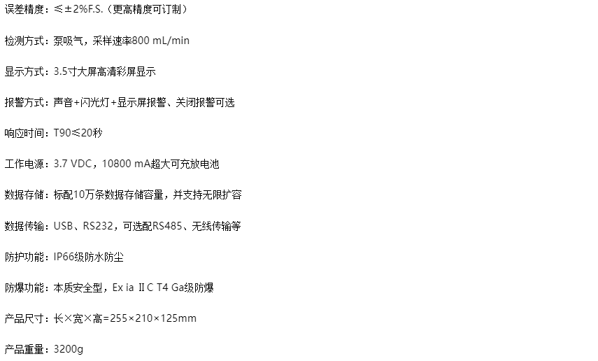 移動手提式惡臭氣體檢測儀為例,可以同時檢測并顯示GB14554中的全部8項惡臭污染物指標,并可選配PM2.5、風速、溫度、PM10、噪聲、風向、濕度、照度等檢測項目指標。另外,該儀器配有10800 mA超大容量電池,可連續(xù)長時間進行工作,具有IP66級防水防塵功能和Ex ia ⅡC T4 Ga級本質(zhì)安全型防爆功能,可適用于各種復雜工況場所中。